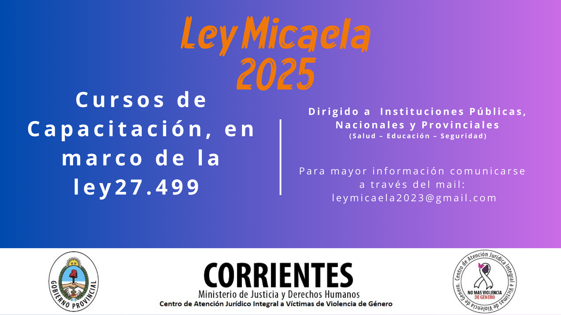 Es un paso fundamental hacia la equidad y la prevención de la violencia de género, se pone en marcha la Capacitación en Ley Micaela 2025, según lo estipulado en el artículo 1°, de la Ley 27.449. Esta capacitación está destinada a los sectores de Salud, Educación y Seguridad, tanto Nacionales como Provinciales, el curso se dicta de modo presencial y/o virtual y al finalizar el mismo se hará entrega del correspondiente certificado. Las instituciones interesadas deben inscribirse lo antes posible para no perder la oportunidad de ser parte de estos cursos. ¡No te quedes afuera! Para mayor información contáctate con nosotros a través del mail: micaela2023@gmail.com o al celular 3794530311 ¡Es hora de avanzar hacia un futuro sin violencia! Línea Gris